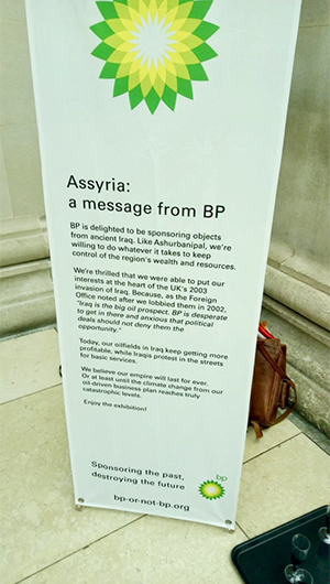Bugün de British Museum’da petrol devi BP’nin sponsorluğuyla açılan Asur medeniyeti sergisi, petrol şirketlerinin sponsorluğuna karşı çıkan Art not Oil ve BP or not BP gibi gruplar tarafından protesto edildi. “Ben Asurbanipal: Dünyanın Kralı, Asur’un Kralı” başlığını taşıyan sergi, “British Museum’un koleksiyonundaki eşsiz Asur hazineleri”yle[1] Asur’un en büyük krallarından Asurbanipal’in dünyasını ziyaretçilere açma iddiasında.