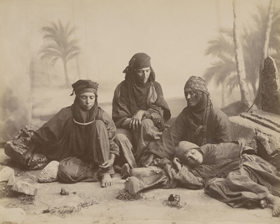 Bonfils, Eriha Bedevileri grup fotoğrafı, 1876-1885 dolayları. Fotoğraf Bonfils’in stüdyosunda, kartonpiyer bir dekorda çekilmiştir. Kaynak: endangered archives
